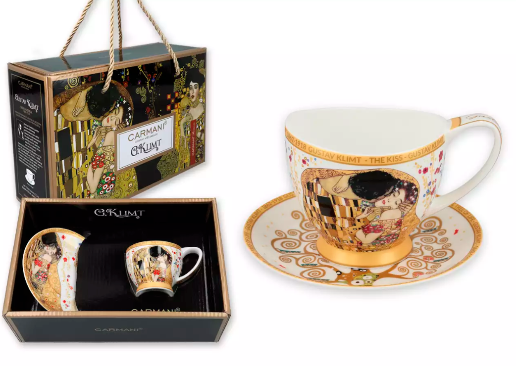 Filiżanka ze spodkiem Vanessa do espresso marki Carmani z motywem obrazu Gustava Klimta z charakterystycznym wcięciem stanowi ozdobę każdego stołu. Filiżanka zachwyca nie tylko kształtem ale także zdobieniem. Zapakowana w ozdobne pudełko, dzięki czemu świetnie sprawdzi się jako prezent.