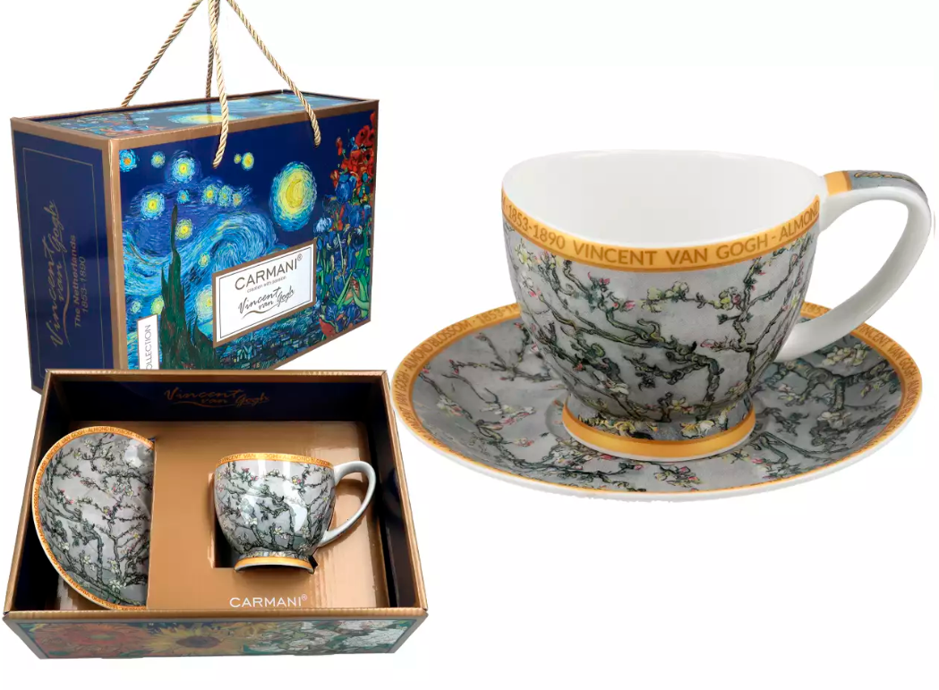 Filiżanka ze spodkiem Vanessa marki Carmani z motywem obrazu V. van Gogh’a z charakterystycznym wcięciem stanowi ozdobę każdego stołu. Filiżanka zachwyca nie tylko kształtem ale także zdobieniem. Zapakowana w ozdobne pudełko, dzięki czemu świetnie sprawdzi się jako prezent.