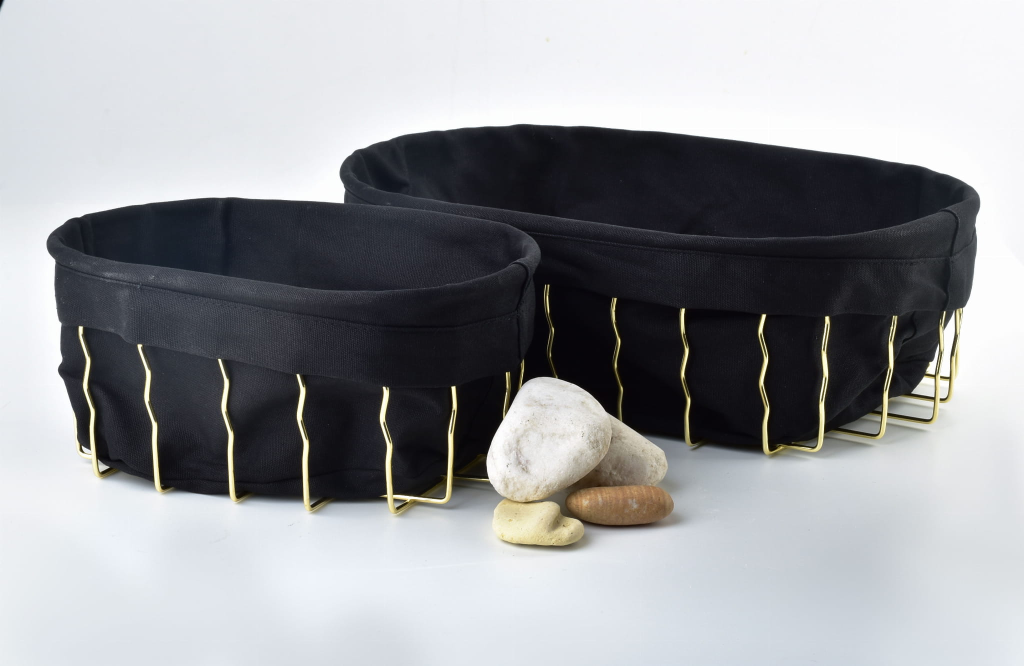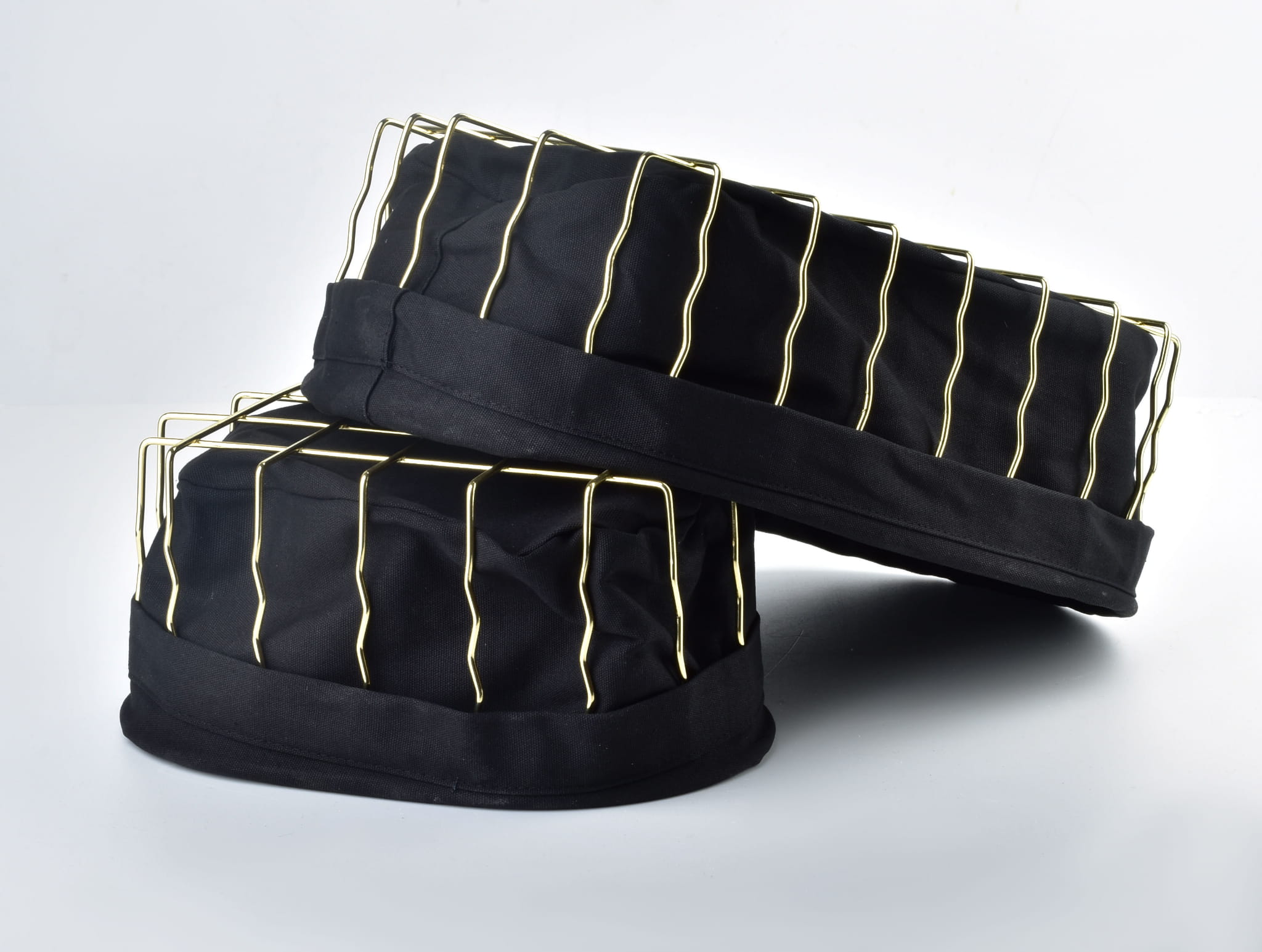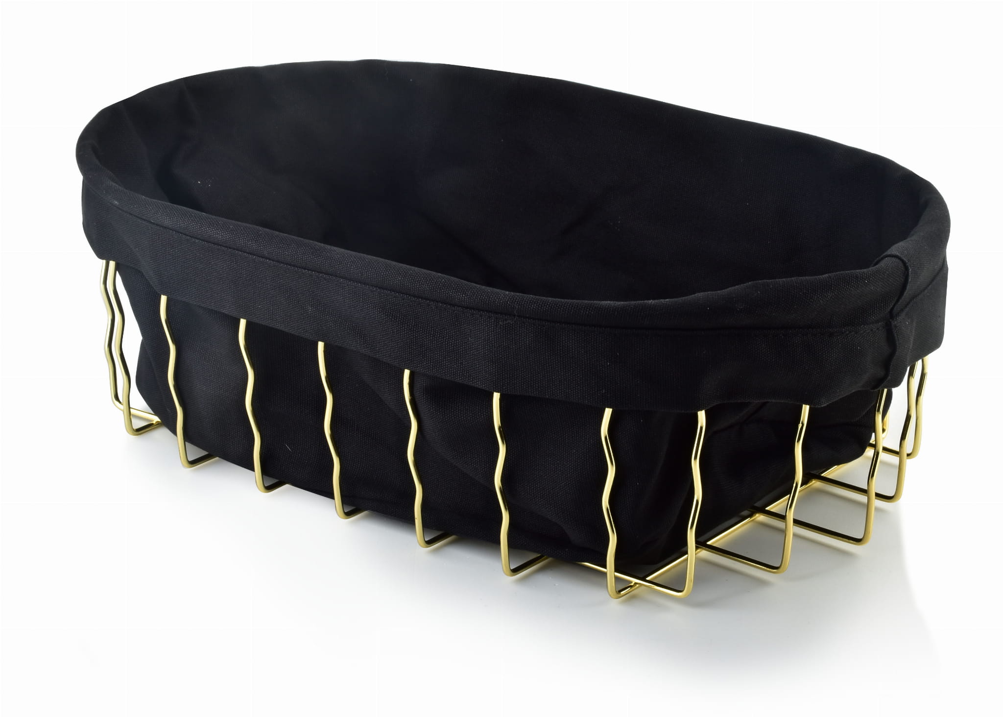 Elegancki koszyk w formie niestandardowego stelaża w eleganckim złotym odcieniu. Kraty stelaża są delikatnie falowane, co czyni koszyk unikatowym. Od wewnątrz pokryty czarnym materiałem. Całość prezentuje się bardzo szykownie i stanie się ciekawą ozdobą. Idealny na owoce, pieczywo lub inne drobnostki.