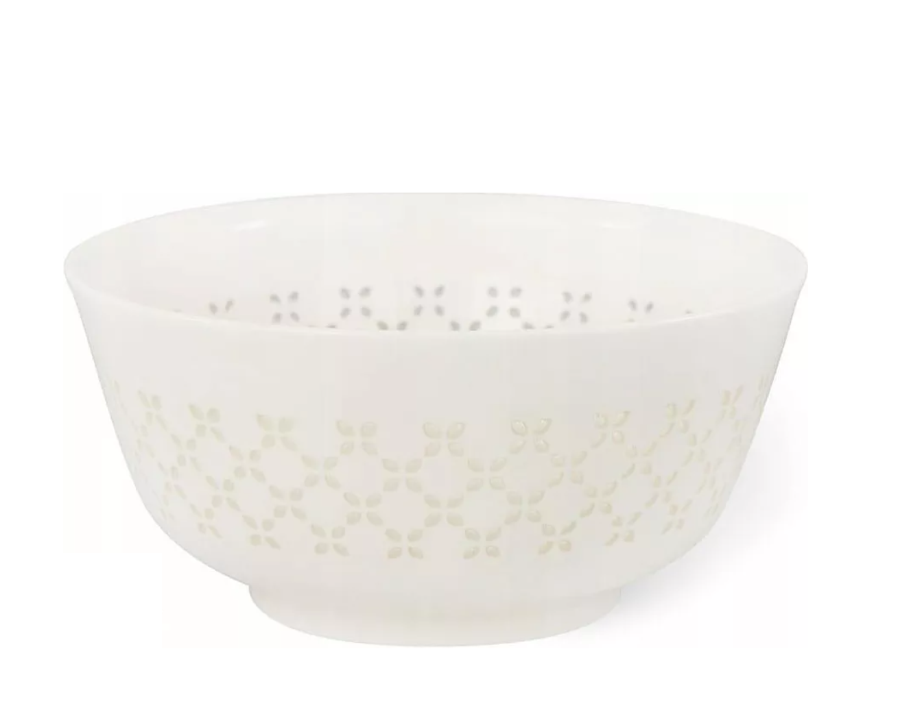 Porcelanowa miska zdobiona ażurowym wzorem, wypełnionym przezroczystym szkłem. Świetnie sprawdzi się do serwowania sałatek, przekąsek itd. Przystosowana do mycia w zmywarce.