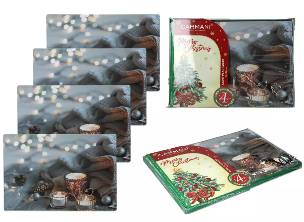 Komplet 4 podkładek korkowych na stół z motywem Świąt Bożego Narodzenia. Doskonale sprawdzą się pod talerze, kubki i inne gorące naczynia.