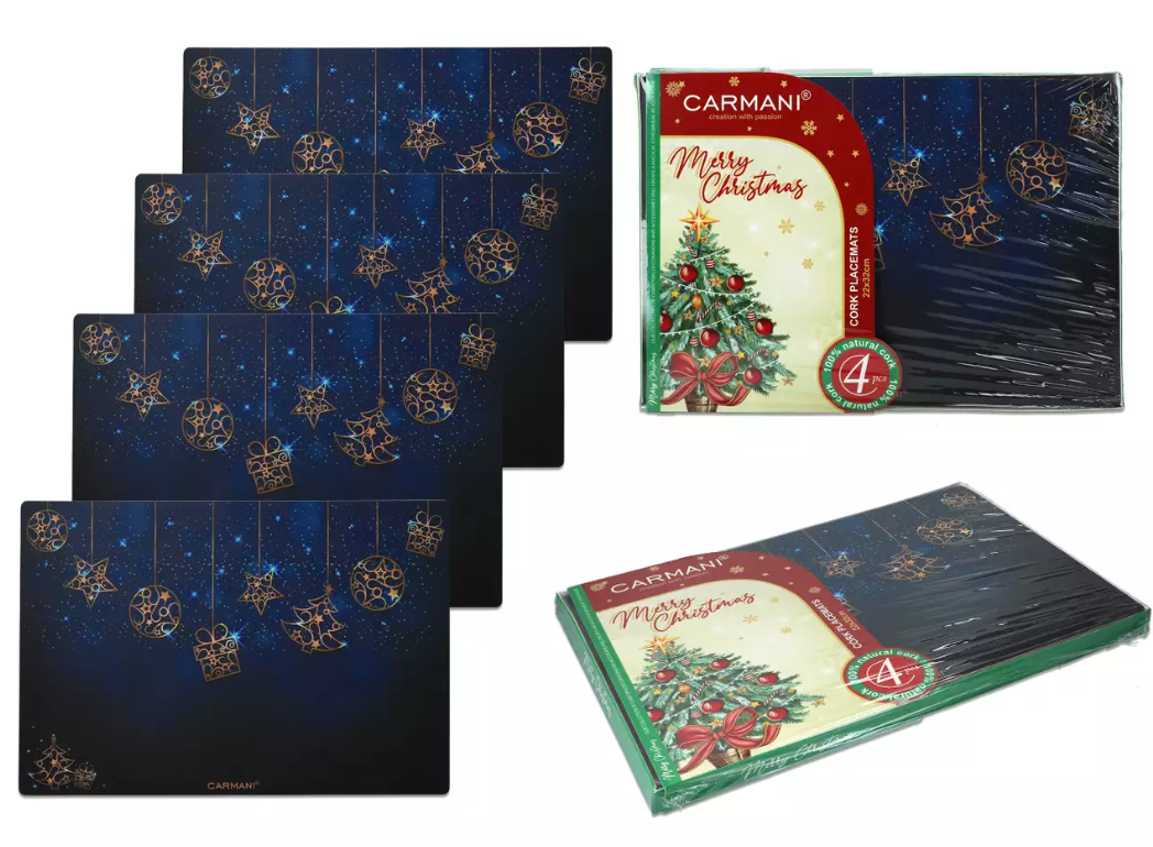 Komplet 4 podkładek korkowych na stół z motywem Świąt Bożego Narodzenia. Doskonale sprawdzą się pod talerze, kubki i inne gorące naczynia.