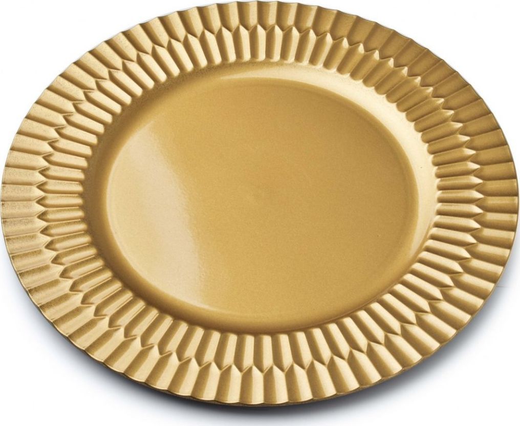 Ozdobna podkładka pod talerz w kolorze złotym wykończona delikatnym wzorem. Może posłużyć także jako samodzielna kreatywna dekoracja. Wykonana jest z tworzywa sztucznego, ale nie zaleca się jej do bezpośredniego użytku z żywnością. Należy myć ją ręcznie.