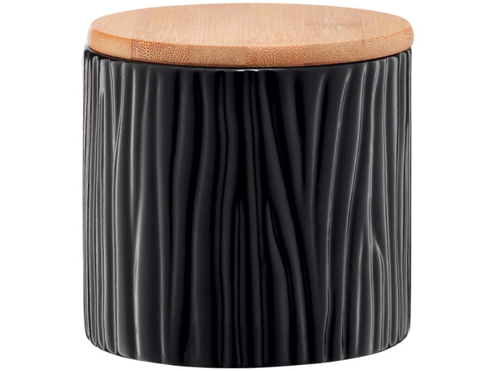 Pojemnik ceramiczny z kolekcji Tuvo marki Ambition o pojemności 670 ml. Czarne naczynie zostało ozdobione tłoczeniami w nieregularne, pionowe pasy.