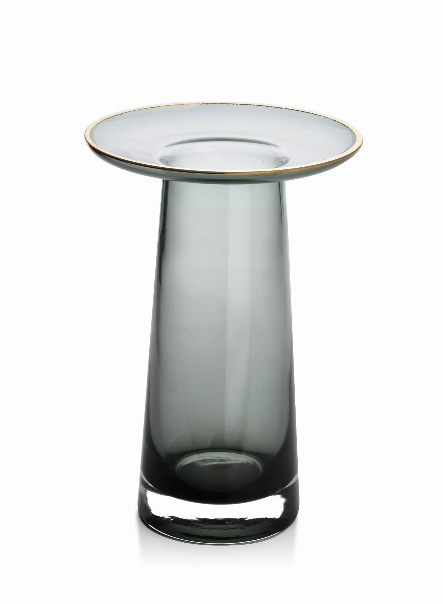 Szklany wazon zakończony intrygującym kołnierzem o kształcie ronda, zwieńczonego eleganckim złotym rantem. Wazon jest niestandardowym dodatkiem, dlatego najlepiej sprawdzi się we wnętrzach w stylu klasycznym lub minimalistycznym. To idealna propozycja dla tych, którzy lubią nowości i ciekawe dodatki. Wazon na pewno będzie przyciągał wzrok wszystkich gości, ale również właścicieli.